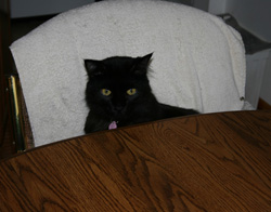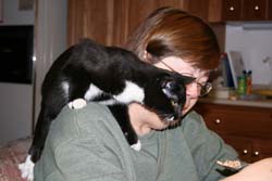 Oreo acts like a Parrot and sits on my shoulder when I'm at the kitchen table. No - I don't feed her from there! She just tries to get my food. |