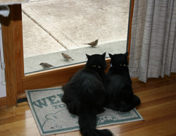 Oreo watching our athletic squirrel at the bird feeder |